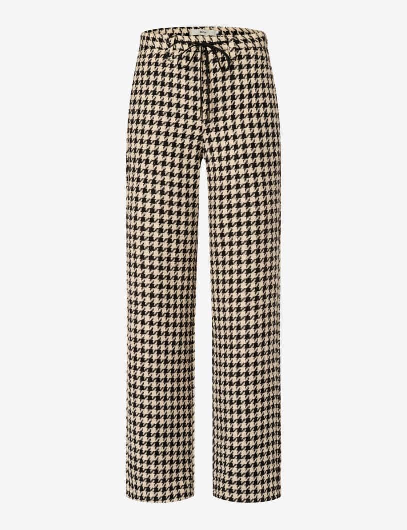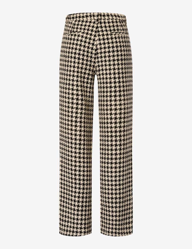 Mit ihrer ausdrucksstarken Hahnentritt-Struktur ist die Palazzohose im STYLE MAINE ein klares Fashion-Statement mit Charakter. Der weite, gerade Beinverlauf betont die fließende Linie der Hose und verleiht ihr eine feminine Lässigkeit. Der elastische Dehnbund mit integriertem Bindegürtel bietet nicht nur einen komfortablen Sitz auf normaler Leibhöhe, sondern bringt auch eine entspannte Note ins Design. Seitliche Nahttaschen fügen sich dezent in die Silhouette ein und die Leistentaschen auf der Rückseite unterstreichen die klare Linie. Besonders raffiniert ist das strukturierte Bouclé-Material, das durch seine mehrdimensional gewebte Oberfläche eine spannungsreiche Textur erzeugt – lebendig, weich und angenehm griffig. Der Stoff aus einem hochwertigen Baumwoll-Polyester-Mix vereint natürliche Atmungsaktivität mit robuster Formbeständigkeit und macht die Hose zu einem idealen Begleiter für modische Alltagslooks. Ein Stil mit Charakter – feminin, komfortabel und selbstbewusst retro.