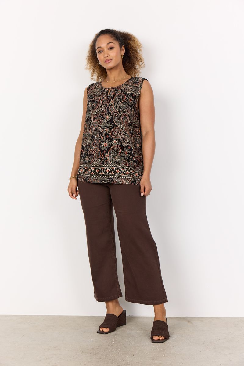SC-ROBYN 1 ist ein ärmelloses Top aus 100% LENZING™ ECOVERO™ Viskose. Es hat einen Rundhalsausschnitt, einen Allover-Paisleymuster und eine Bordüre am Saum. Dieses Oberteil kann mit einer maßgeschneiderten Hose für einen arbeitsgerechten Look oder mit einer Jeans für einen lässigen Ausflug kombiniert werden.